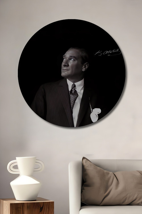 Beta Moda Hub Mustafa Kemal Atatürk İmza Detaylı Siyah Beyaz Görünümlü Ahşap Tablo Yuvarlak Duvar Tablosu