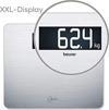 XXL formatında cam tartı, ekstra büyük basma yüzeyi ve modern, aydınlatmalı siyah ekran, özel geliştirilmiş LCD yazı tipi.;