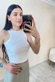 Beyaz Damla Taş İşlemeli Dokuma Kumaş Crop Top