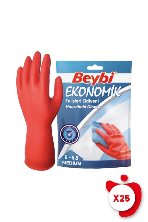 Beybi Ekonomik Ev İşleri ve Bulaşık Eldiveni 8-8,5 Beden Kırmızı 25 Paket