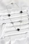 Gümüş renkli zinciri, siyah ve zirkon taşlarla süslenmiş yonca figürü ile tamamlanıyor.