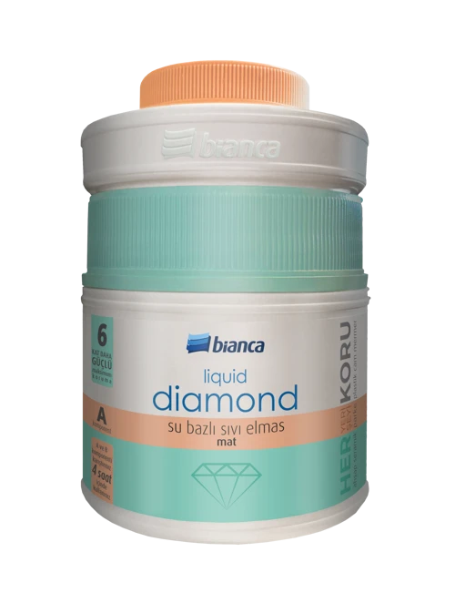 Bianca Liquid Diamond (Sıvı Elmas) uygulaması yapılacak yüzeyler; her türlü kir, yağ ve tozdan, eski boya kalıntılarından arındırılmış temiz ve kuru olmalıdır. Bianca Liquid Diamond (Sıvı Elmas) iki kompenentli bir üründür. Uygulama için A kompenenti (büyük amb.) ile B kompenenti (küçük amb.) karıştırınız. Yapılan karışımı 4-6 saat içinde kadife vernik rulo yardımı ile yayarak uygulayınız. Kuruyan noktalarda tekrar fırça ve rulo darbesi yapmamaya özen gösterin.