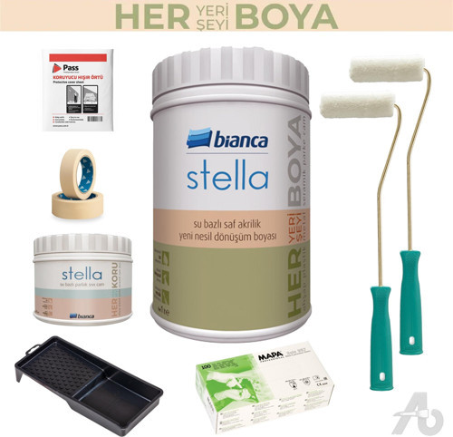 Bu set, iç mekân dolap ve mobilyaları boyayıp üzerine koruyucu vernik uygulamak isteyen kullanıcılar için hazırlanmıştır. Bianca Stella su bazlı saf akrilik boya, MDF, suntalam, masif ahşap ve mevcut boyalı yüzeylerde kapatıcı ve temizlenebilir bir yüzey oluşturur. Üst katmanda kullanılan Bianca Stella su bazlı parlak sıvı cam vernik ise boyayı suya, ev tipi temizlik kimyasallarına ve günlük kullanımdan kaynaklanan sürtünmeye karşı ek bir koruma tabakası ile destekler.