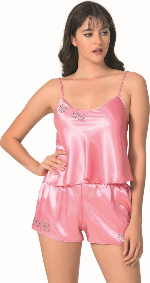 Bicomi Koyu Pembe Saten Gecelik Babydoll Şort Takımı