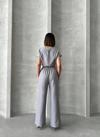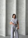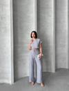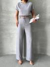 - Bluzunun düz kesimi ve pantolonunun yüksek bel tasarımı ile trend bir stil sunar.