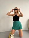 Çift yırtmaç detayıyla öne çıkan yeşil atlas şort etek, gardırobunuzun favori parçalarından biri olmaya aday.