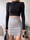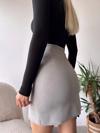 Şık ve şıklığıyla ön plana çıkan Çift yurtmaçlı süet etek gri s241002, gardırobunuzun vazgeçilmezi olmaya aday!