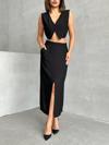 KAZAX markasının şık ve zarif tasarımıyla öne çıkan çilek takımı, etek ve yelek kombinasyonuyla dikkat çekiyor.