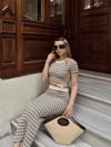 Pembe çizgili etekli takım, şıklığı ve rahatlığı bir arada sunar.