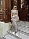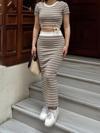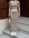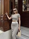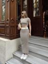 Pembe çizgili etekli takım, şıklığı ve rahatlığı bir arada sunar.