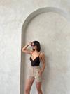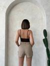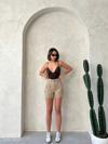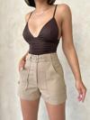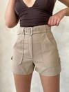 Bu bej gabardin şort, şıklığı ve rahatlığı bir arada sunmaktadır. Klasik kesimi ve detaylı kemer tasarımı ile günlük kullanıma uygun bir seçenektir.