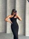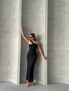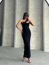Krinkıl tek omuz uzun elbise siyah, şıklığı ve rahatlığı bir arada sunar.
