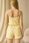 Canlı sarı tonuyla enerjik bir görünüm sunan bu pijama takımı, modern desenleriyle şıklığı ve rahatlığı bir araya getiriyor. İnce askılı üstü ve konforlu şort modeli sayesinde yaz gecelerinde ferahlık hissi verir.