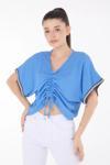KAZAX markasının şıklığı ve rahatlığı bir araya getiren V yaka büzgülü detaylı bluz, gardırobunuzun vazgeçilmezi olmaya aday.