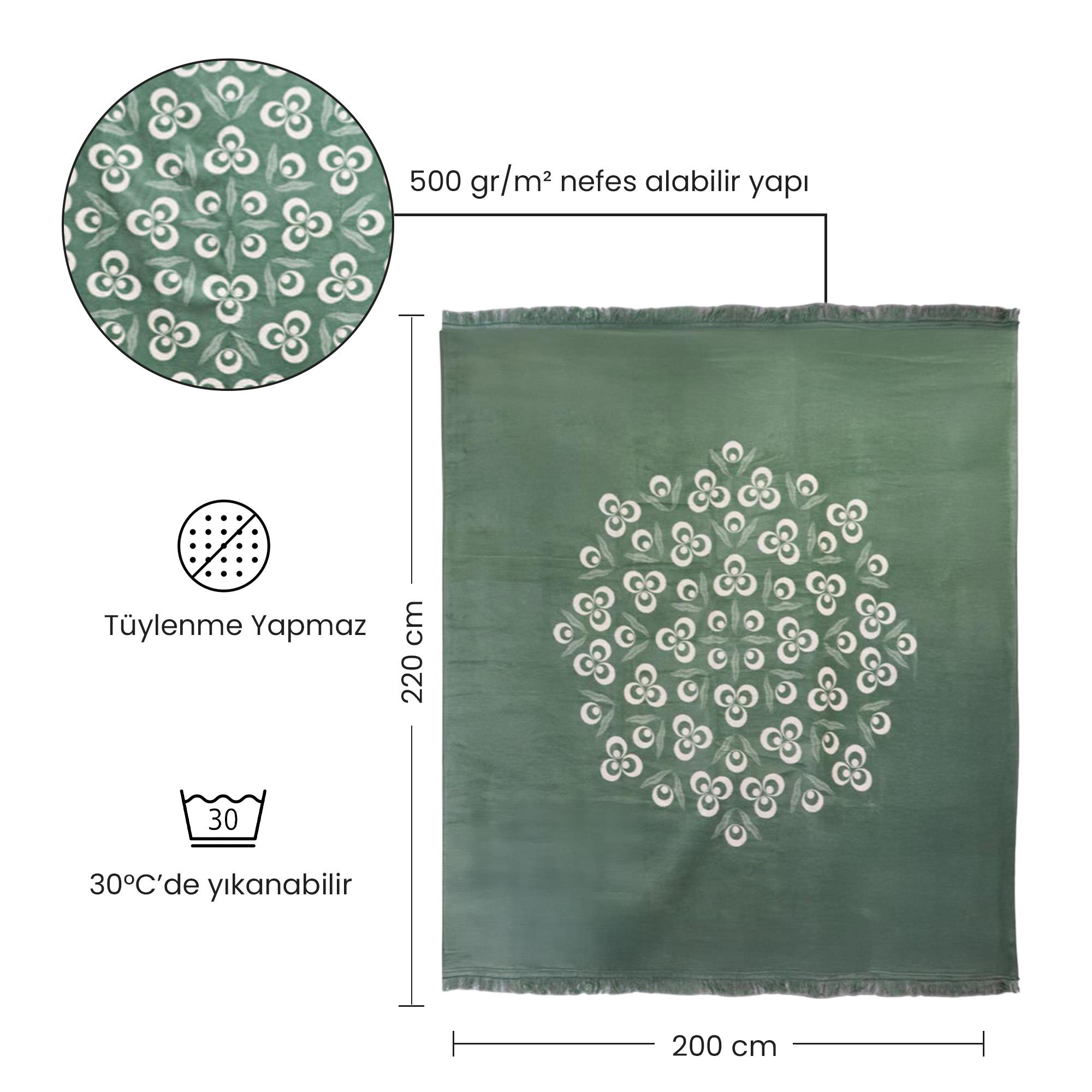 500 gr/m² yoğunluğundaki kaliteli dokusu, soğuk günlerde vücudu sıcak tutarken nefes alabilir yapısıyla terlemeyi önler. Çintemani deseni ve modern yeşil tonları, yatak odanıza estetik bir dokunuş kazandırır.