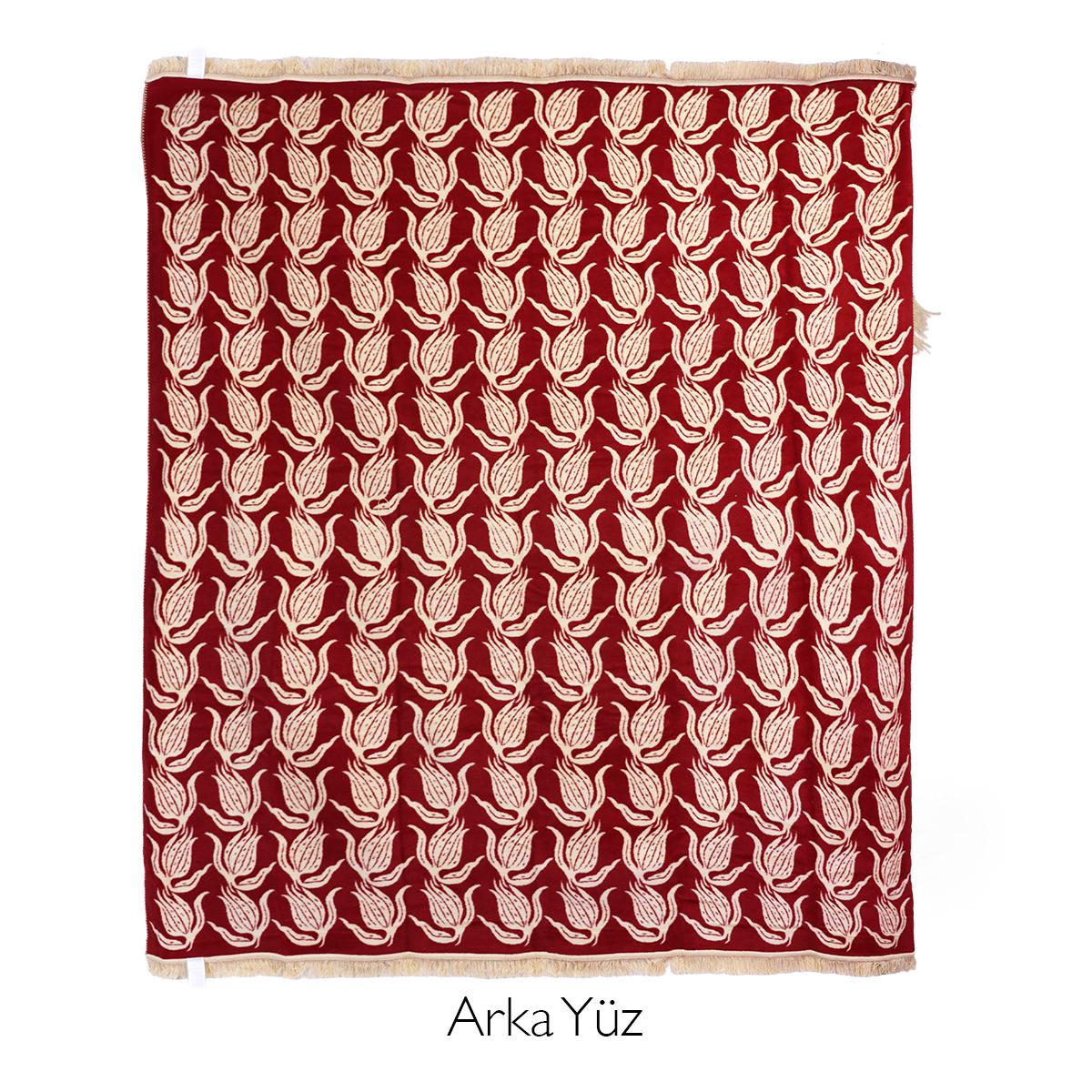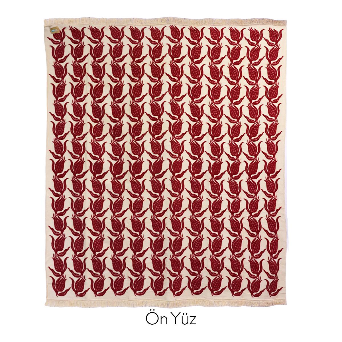 Krem zemin üzerine işlenmiş kırmızı lale desenleri, Türk dokuma geleneğini modern bir çizgide evinize taşır.