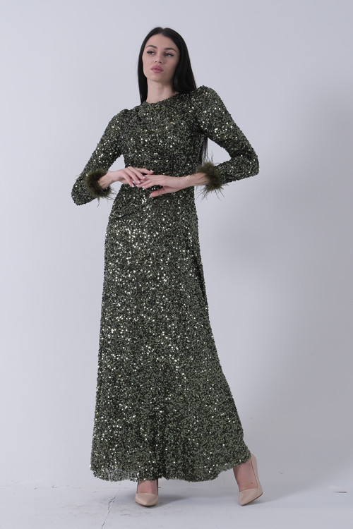 Bilek Ucu Tüylü Pul Payetli Tesettür Abiye