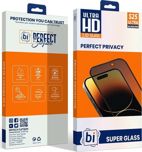 Binano Privacy Super Glass Cam Ekran Koruyucular, telefonunuzun sağından ve solundan 45 derecelik bir açıya kadar bakıldığında, telefondaki içeriğin görülmesini engeller.