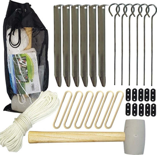 - Rüzgardan etkilenen tüm dış mekan tente ürünlerinde toprak yere sabitlemek için kullanabileceğiniz aparat setidir. Çelik kazıklar ve kauçuk gerdirme aparatları max. gerginlik sağlar ve esnemeyi belli bir seviyede tutar. Plastik regülatörler bağlama gerekmeden ipi montajlamak için kullanılır. Taşıma çantasında her zaman yanınızda derli toplu bulundurabilirsiniz.