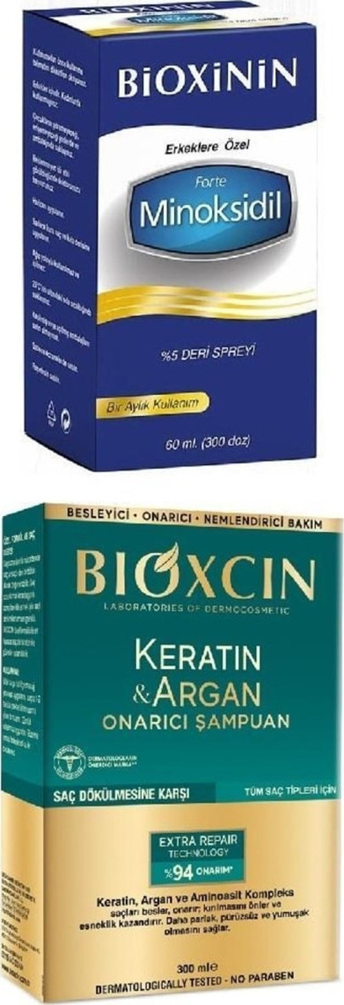 Bioxinin Forte Minoksidil %5 Deri Spreyi 60 ml + Bioxcin Keratin & Argan Onarıcı Şampuan 300 ml,