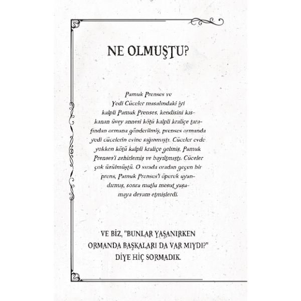 Oysa arka plandakilerin, gizli kahramanların neler yaşadığını keşfedip olaylara bir de onların gözünden bakmalı. Mesela masalda sadece 7 cüce mi vardı? Geppetto Usta'nın, bir oğuldan başka isteği yok muydu? Çiftlikteki tavuklar altın yumurtlayamadıkları için ne hissetmişlerdi? Rapunzel masalında “oradan geçen bir prens”in neden adı sanı yok? Peki Kırk Haramilerin kırkı da kötü müydü?