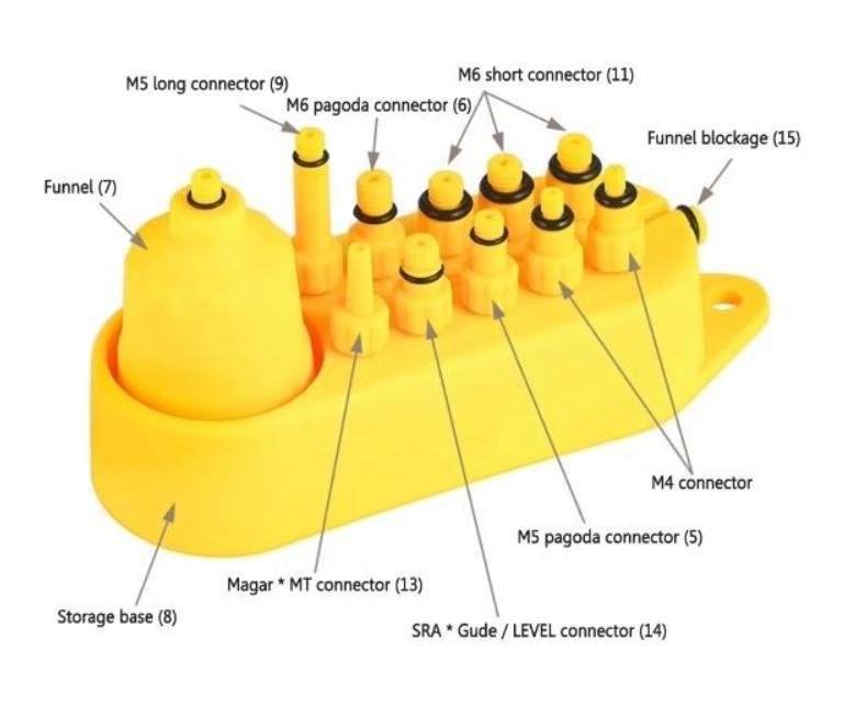 Paket: 2 x hortum, 1 x hortum tokası, 1 x hortum kontrol kelepçesi, 2 x lastik bant, 2 x eldiven, 2 x piston durdurma, 1 x şişe boşaltma, 1 x şırınga deliği, 1 x huni, 1 x huni fişi, 2 x M4 adaptörü, 2 x M5 adaptörü, 4 x M6 adaptörü, 1 x M7 adaptörü (metal set dahildir), 1 x Sram Kılavuz Seviye adaptörü, 1 x Magura adaptör, 1 x boşluk dengeleyici, 4 x anahtarlar, 1