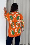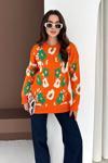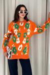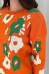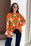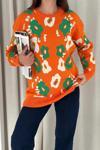 Bisiklet Yaka Uzun Kollu Çiçek Desenli Oversize Triko Kazak Turuncu