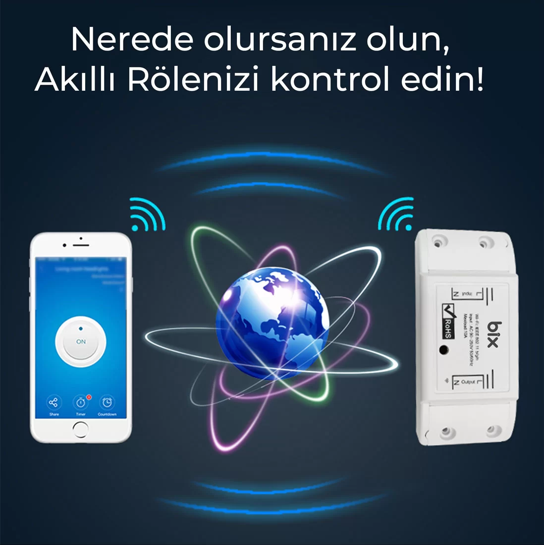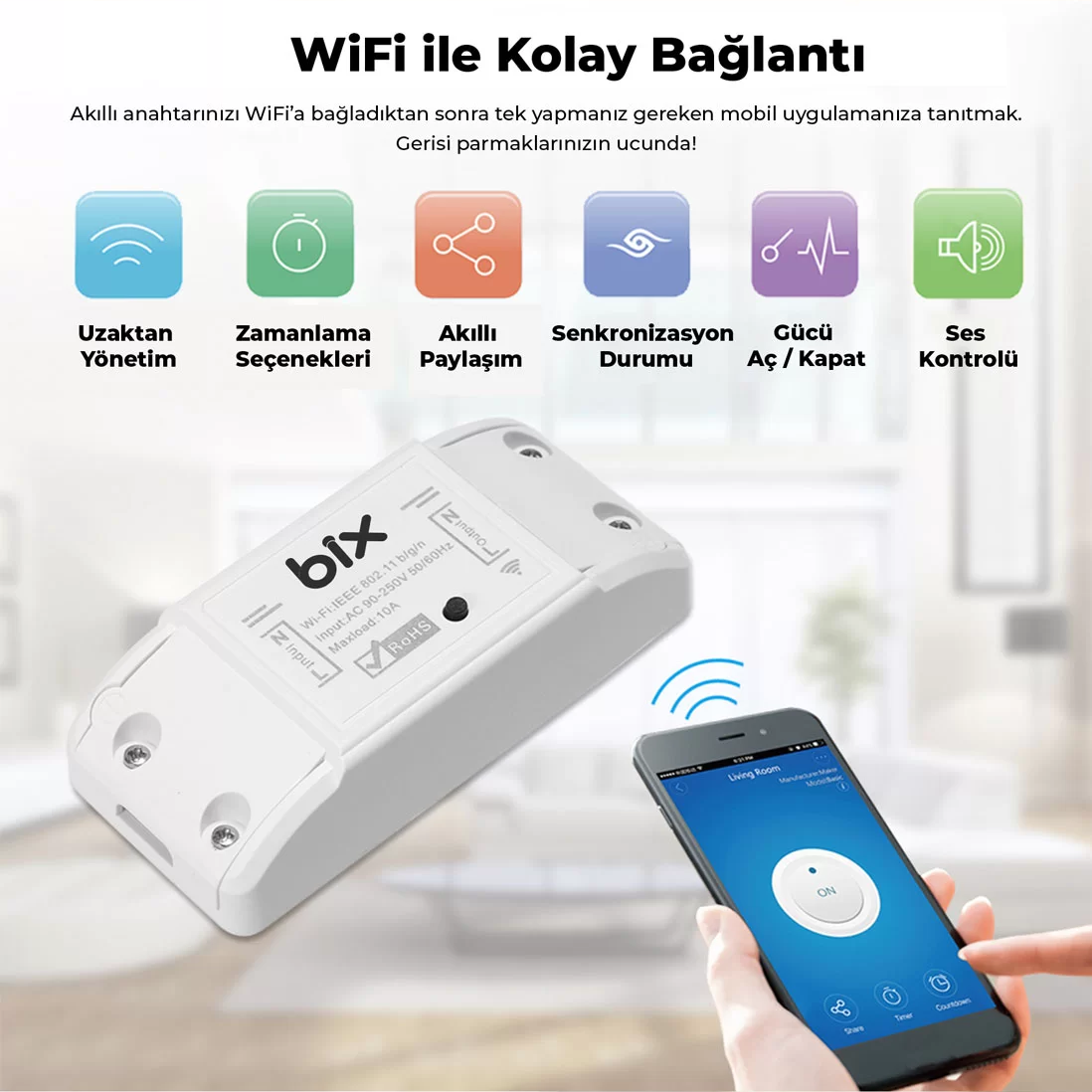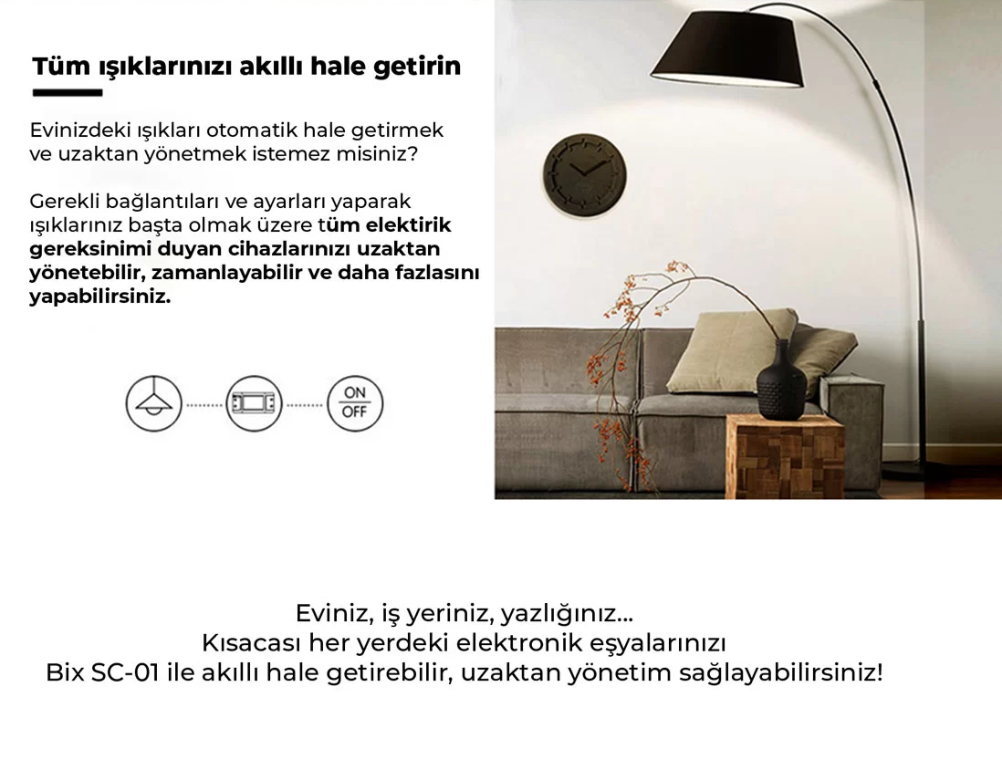 Bix SC-01 Uzaktan Kontrol ve Zaman Ayarlı Akıllı Priz ile evinizdeki veya iş yerinizdeki elektrikli cihazları akıllı bir hale getirebilirsiniz. Hayatınızı kolaylaştıracak olan Bix SC-01 Akıllı Röle ile daha kolay bir yaşantı sizleri bekliyor. Mobil uygulamasıyla; uzaktan yönetim, sesli komut verme, açma/kapama zamanlama gibi birçok işlemi de yapabilirsiniz.