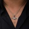 Köpek balıkları özellikle yırtıcı ve korkutucu simgeler olarak anlamlandırılır. Denizlerin kralı olan köpek balıkları zekayı ve özgürlüğü temsil eder. Sevdikleriniz için özgürlüğün sembolü olan köpek balığı kolye ile anlam dolu bir hediye vermeye ne dersiniz? Özel tasarım köpek balığı kolye boynunuzdan çıkarmak istemeyeceğiniz kolyelerden biri olacaktır. 925 ayar gümüşten imal edilmiş bu özel tasarım kolyeyi sevdiğiniz ve değer verdiğiniz kişilere hediye edebilirsiniz. Gümüş köpek balığı kolye üzerine oksit kaplama yapılmıştır. Oksit kaplama yapılan gümüş kolye modelleri parlaklığını uzun süre muhafaza eder. Tüm gümüş kolye modellerinin tamamında olduğu gibi gümüş köpek balığı kolye modeli de el emeği ile üretilmiştir. Gümüş ve değerli taşlar nedeniyle belirtilen ortalama ürün ağırlığında ± %10 sapma olabilmektedir.