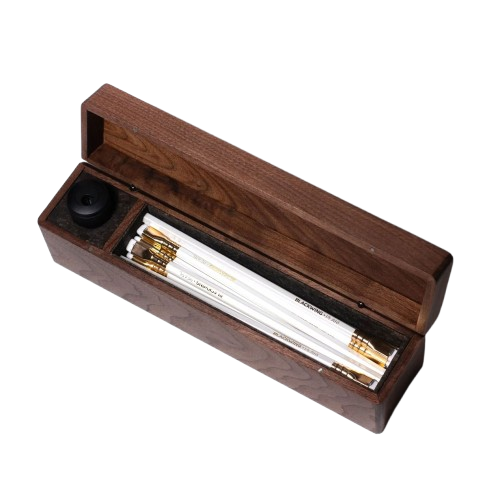 Mixed Walnut Gift Box, 24 adet Blackwing kalemden oluşur — Mat, 602, Pearl, Natural modellerinden her birinden 6’şar adet içeren Karışık Set olarak sunulur. Ayrıca set içerisinde, popüler Tek Adımlı Uzun Uçlu Kalemtıraş da yer alır. Kutunun iç kısmı, kalemlerinizi koruyan yumuşak mantar astarla kaplanmıştır.