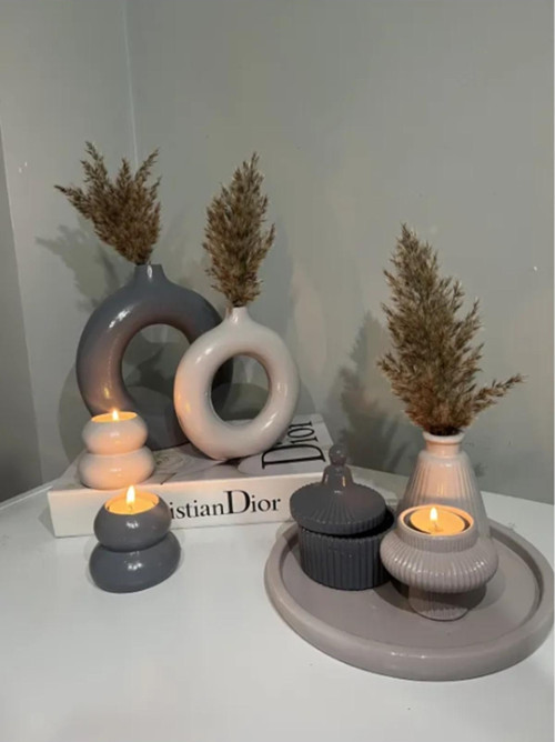 İki adet halka vazo ve mumluk ile birlikte gelen set, hem pratik hem de estetik bir kullanım sağlar