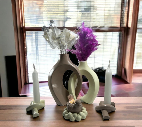 Ürün ölçüleri: büyük vazo 22x16 cm küçük vazo 17x14 cm 2’li şamdan Düğüm mumluk 8x3 cm dir.