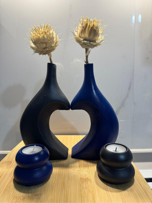 Blanj Kalpli Sarılan Sevgili Vazo Ve Mumluk Lacivert-Siyah