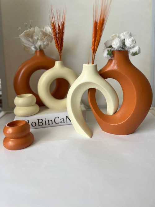 - Bohem tarzının özgün dokunuşlarını evinizin her köşesine taşıyan kiremit renkli beton vazolar.