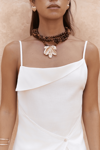 Omuzları ip bağlama detaylı, keten karışmlı uzun boy elbise. Ön asimetrik kesim düğme kapamalı tasarım. Astarlı.