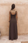 Omuzları ip bağlama detaylı, keten karışmlı uzun boy elbise. Ön asimetrik kesim düğme kapamalı tasarım. Astarlı.