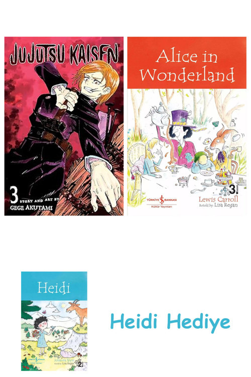 Jujutsu Kaisen, Vol.; 3: Volume 3 + Alice in Wonderland + Heidi Siparişleriniz, kargo sürecinde zarar görmemesi için dikkatle paketlenerek gönderilir.; Dilerseniz hediye paketi seçeneğinden faydalanabilirsiniz.; Ayrıca sevdiklerinize özel bir sürpriz yapmak isteyen müşterilerimiz için kişiye özel hediye notu hazırlanabilmektedir.; Hediye paketi ve not taleplerinizi sipariş esnasında belirtmeniz yeterlidir.; Ürün görsellerinde ve açıklama kısmında belirtilen tüm ürünler eksiksiz ve belirtilen şekilde gönderilmektedir.; Müşteri memnuniyeti önceliğimizdir.; Ürünle ilgili her türlü soru, talep ve destek için Ürün Sorusu bölümünden bizimle iletişime geçebilirsiniz.