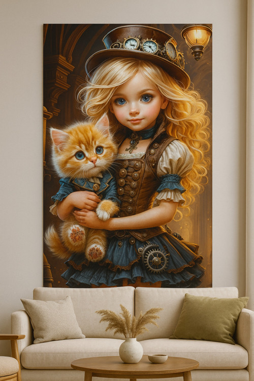 - Tek parça halinde sunulan bu cam tablo, Fantastik Steampunk Kız ve Kedi Portresi temasıyla dikkat çeker.