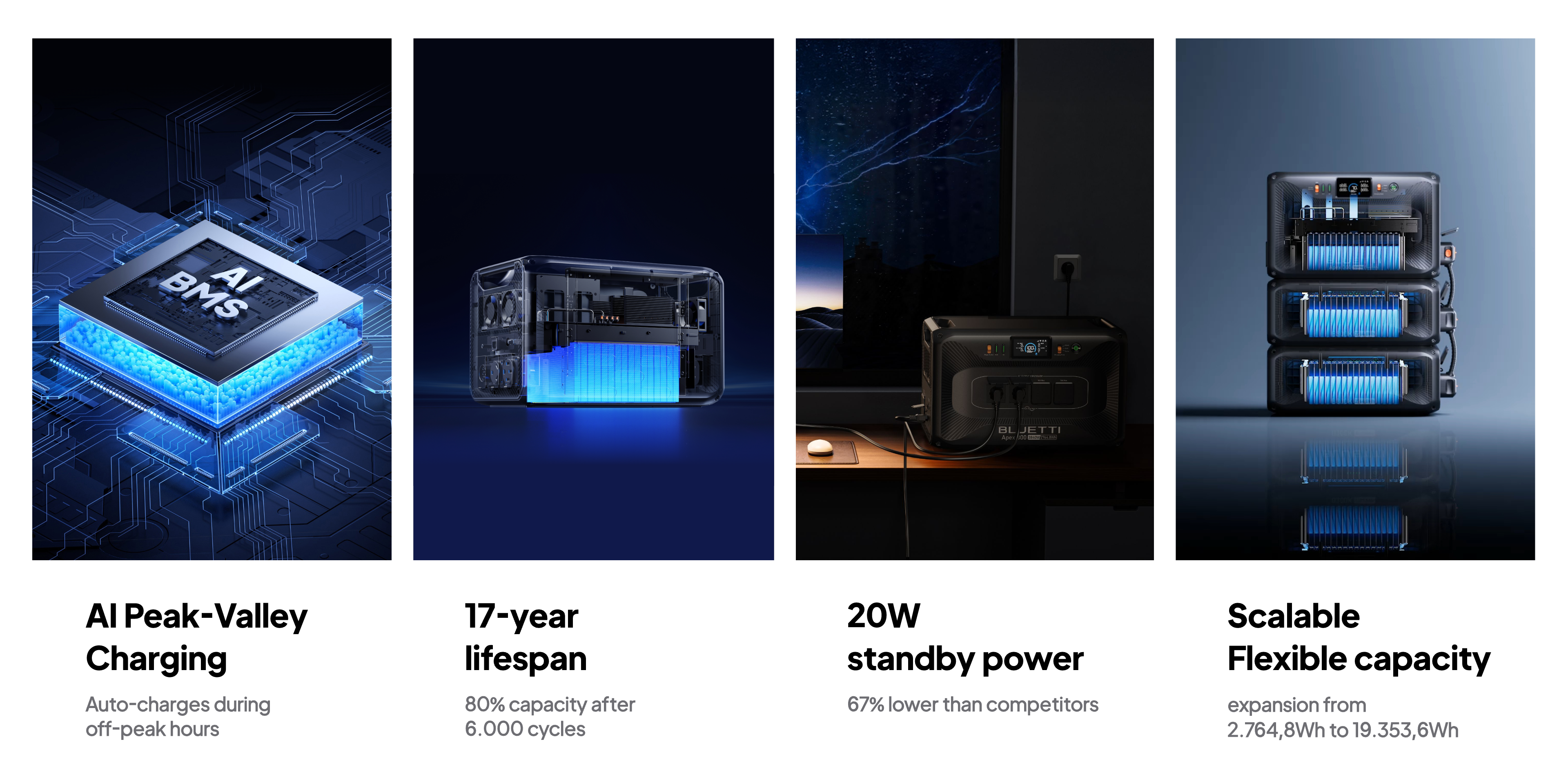 Süper ölçeklenebilir: 2.764 Wh'den 58 kWh'ye kapasite, 3.840 W'den 11,52 kW'ye çıkış gücü