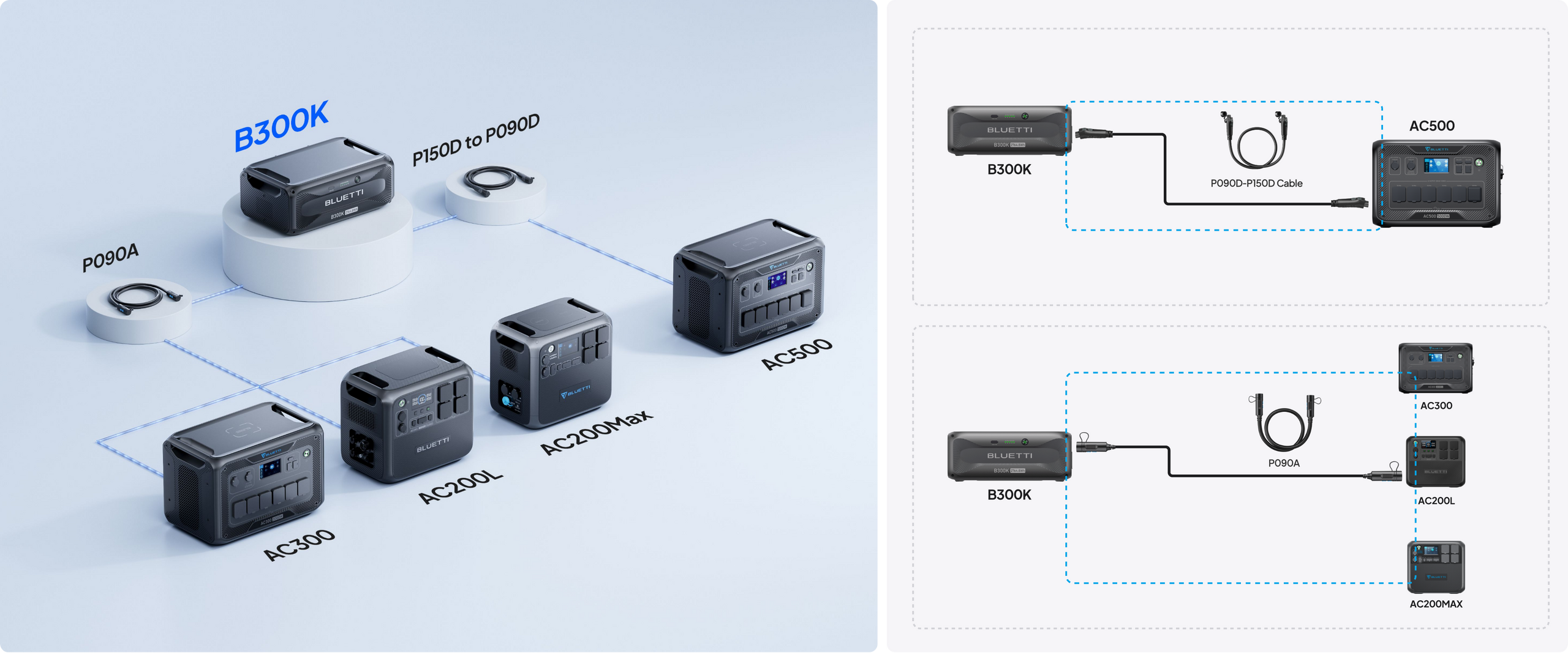 - BLUETTI AC200PL / AC200MAX / AC300 / AC500 ile uyumludur.