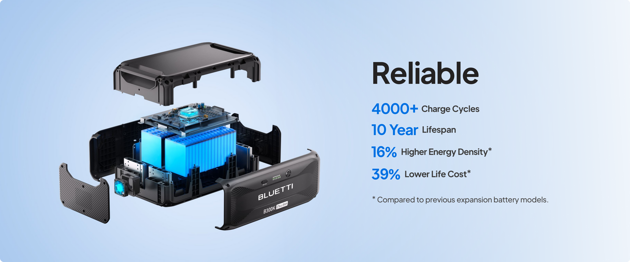 B300K, güvenlik ve güvenilirlikte mükemmellik sunmak üzere tasarlanmıştır. Kare LiFePO₄ piller ve son teknoloji AI-BMS teknolojisinin yanı sıra sağlam alüminyum kasa, gelişmiş kablosuz bileşenler ve verimli soğutma fanı, bu pilin zaman testine dayanmasını sağlayarak her durumda güvenebileceğiniz bir güç kaynağı sunar.