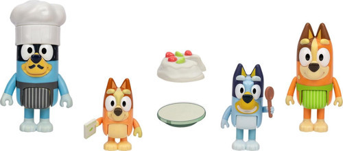 4 adet figür: Bluey, Bingo, Bandit (şef şapkası ve bıyıkla) ve Chilli karakterleri setin içinde yer alır.