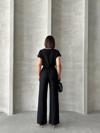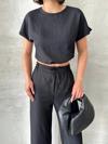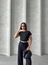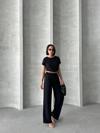 - Bluzunun düz kesimi ve pantolonunun yüksek bel tasarımı ile trend bir stil sunar.