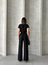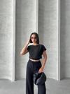 - Bluzunun düz kesimi ve pantolonunun yüksek bel tasarımı ile trend bir stil sunar.