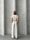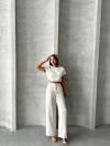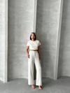 - Bluzunun düz kesimi ve pantolonunun yüksek bel tasarımı ile trend bir stil sunar.