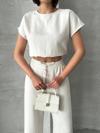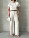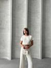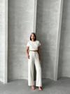 - Bluzunun düz kesimi ve pantolonunun yüksek bel tasarımı ile trend bir stil sunar.