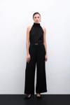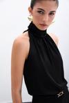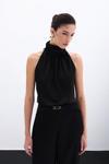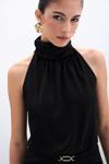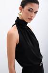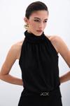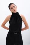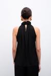 Boğazlı yaka, kalça boy, arka yaka düğmeli kapamalı, kolsuz bluz.