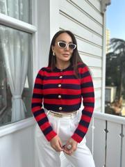 - Rahat kesimi ile günlük kullanım için ideal, triko şeritli kısa hırka.