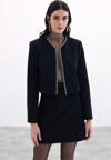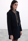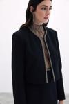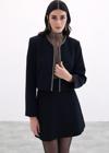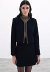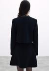 Düz yaka, düz uzun kol, iç astarlı, boncuk aksesuarlı kısa ceket.