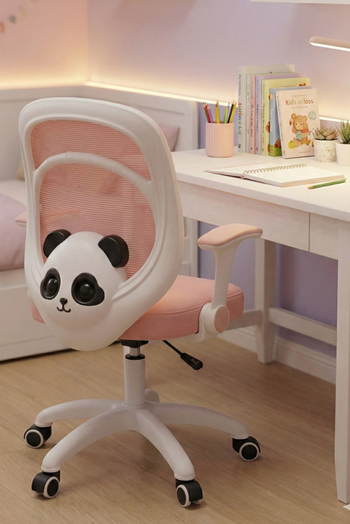 Sevimli panda figürlü sırt tasarımı, çocukların sandalyeyi isteyerek kullanmasını sağlar.